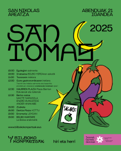Datorren domekan, abenduaren 21ean, San Tomas azoka izango dugu Bilboko Areatzaren inguruetan. Urtero bezala, agertokia eta txosna paratuko dute Bilboko Konpartsek San Nikolas ondoan, eta bertan, besteak beste, bertsolariak, dantza plaza, erromeria, indaba eta txerriki banaketa, 2026ko egutegien salmenta eta otzararen zozketa egongo dira.