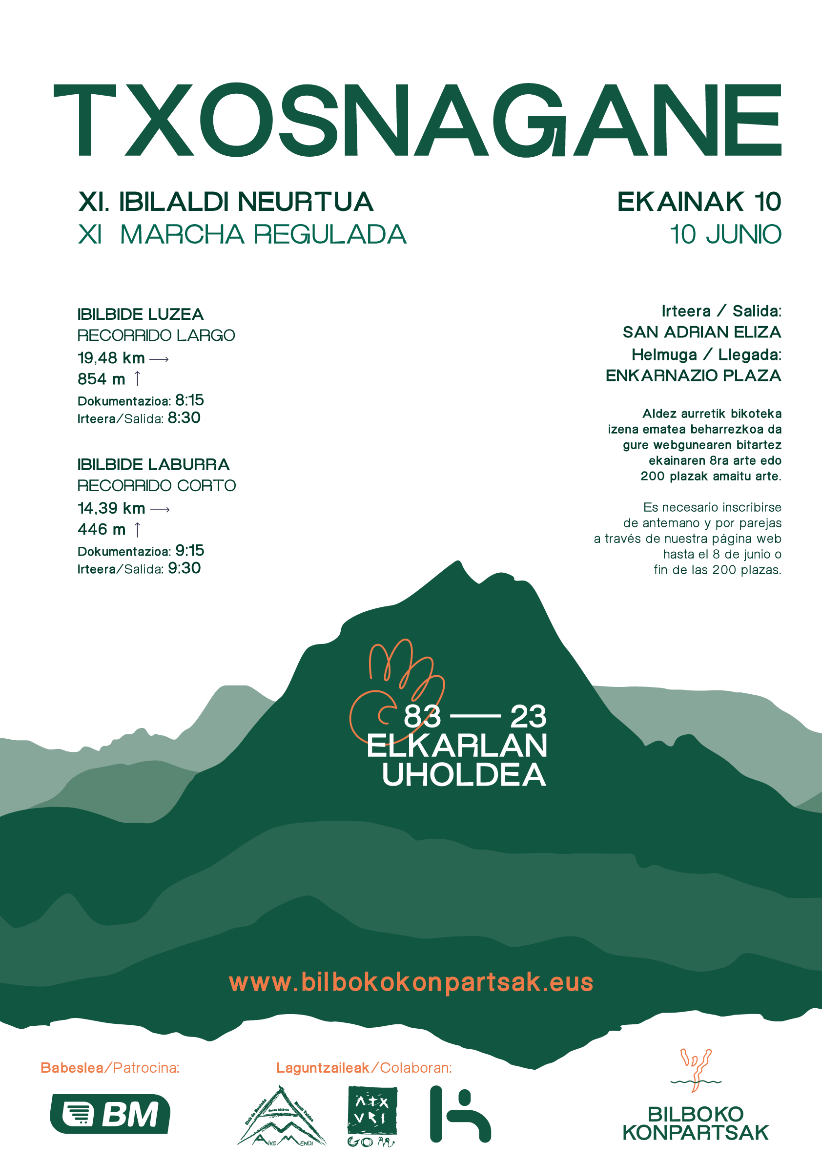 Bilboko Konpartsak federazioak Txosnagane mendi-igoeraren XI. ekitaldian izena emateko epea zabaldu du. Ekainaren 10ean izango da ibilaldi neurtua eta izen-ematea doan eman daiteke bikoteka, ekainaren 8ra arte, konpartsen bilbokokonpartsak.eus webgunean
