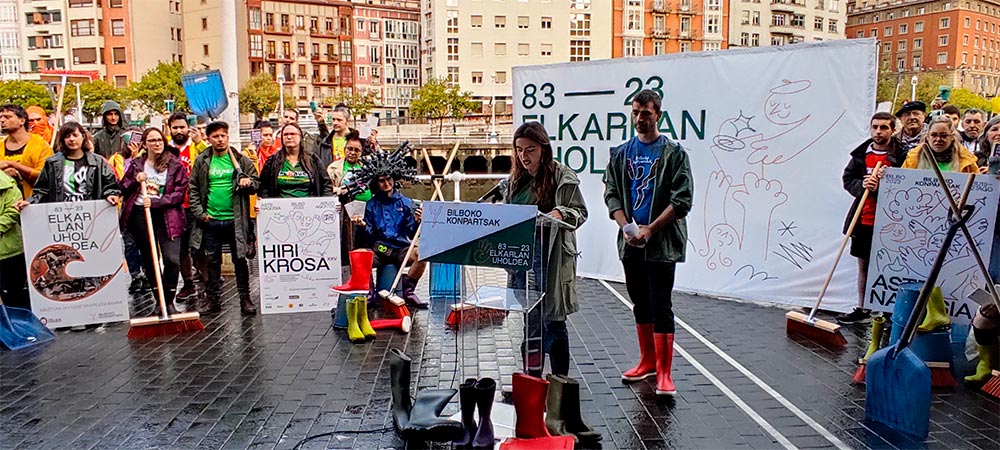 Gaur Sendejako tingladoetan egindako agerraldian, palak eta eskoboiak eskuetan eta zirak eta katiuskak jantzita zituzten dozenaka konpartsakidek lagunduta, Bilboko Konpartsen izenean mintzatu dira Haizea Larrosa eta Ioritz Varona eledunak. Izan ere, aurten 40 urte beteko dira uholdeek Bilbo hondatu zutenetik. Ondorengo egunetan bilbotarrek, palak, eskobak eta katiuskak hartuta, gure auzoak garbitzeko ahalegin kolektibo erraldoia egin zuten. Horren harira, Bilboko Konpartsak federazioak, Elkarlan Uholdea kanpaina egin du aurten, konpartsek bertan izan zuten rol garrantzitsua nabarmendu eta elkarlanaren balioa azpimarratzeko. Bada, kanpainari amaiera emateko oroimen ekitaldi hunkigarria antolatuko dute abuztuaren 26an, 13:00etan, Plaza Barrian, hainbat lekuko eta artistaren ekarpenekin. Hori dela eta, aurten, tirada laburreko edalontzi berrerabilgarri berezia atera dute, uholdeen irudiekin apaindua, uholdeak hasi ziren egun beraren urtemugan saltzekoak.