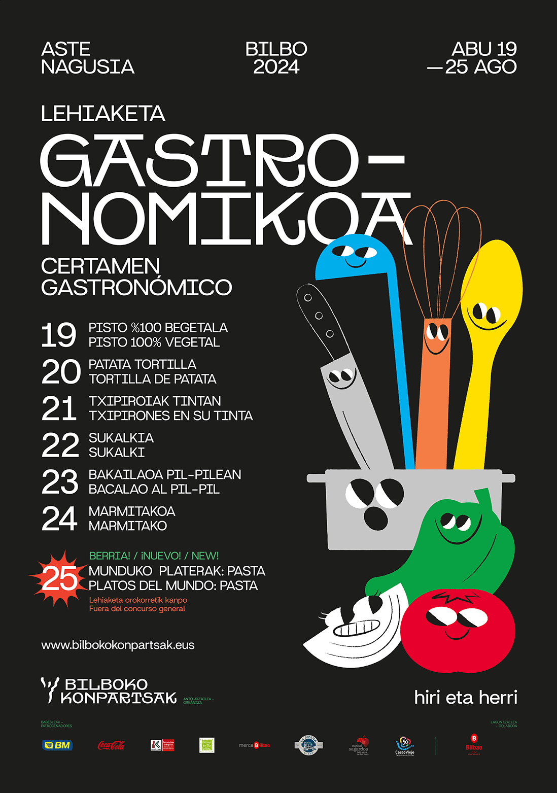 Azken domekan, abuztuaren 25ean, pasta lehiaketa herrikoia izango da, gastronomia lehiaketatik kanpokoa, baina sariak izango dira ere, txapelak, garaikurrak eta sari ekonomikoak, ohi bezala. Zezen buztana desagerrarazi dugu eta pasta lehiaketa aukeratu, hainbat arrazoirengatik, baina, batez ere, jaien izaera herrikoia babesteko, sukaldarien aniztasuna bermatuz eta txapelketa denon eskura jarriz. Pasta munduko txoko guztietan kozinatzen da, era ezberdin askotan, eta makarroi plater gozo-gozo bat izan dezakegu 10 minututan, baina baita mimoz prestatutako delicatessen gutizia bat ere. Hori dela eta, Aste Nagusiko azken zapatuaren ostean indarrak berreskuratzeko, txapelketan parte hartzera animatu nahi ditugu Bilbo eta inguruko sukaldari eta pastazale guztiak.