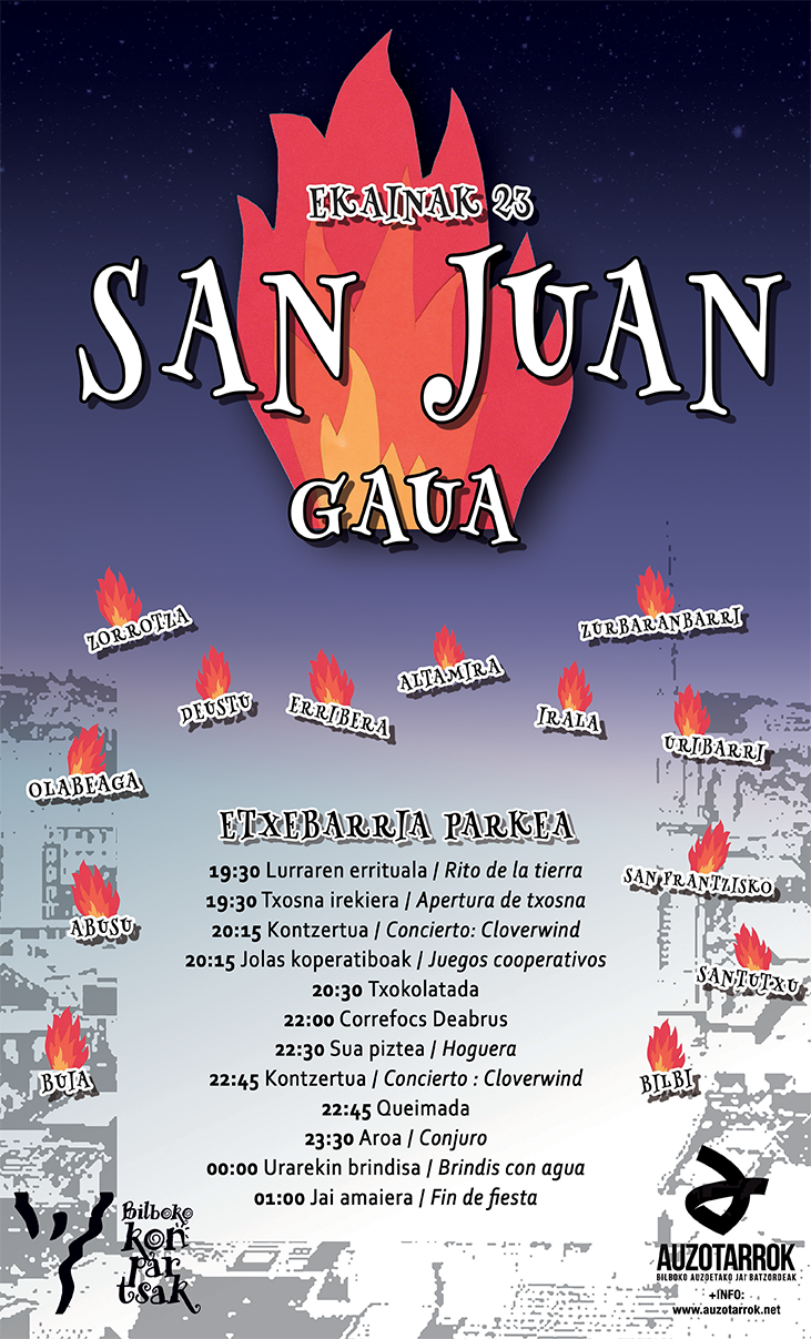 San Juan bezpera eta udako solstizioa dela eta, Bilboko Konpartsok gau magikoa prestatu dugu Etxebarria parkean, biharko ekainaren 23rako, ostiralerako.