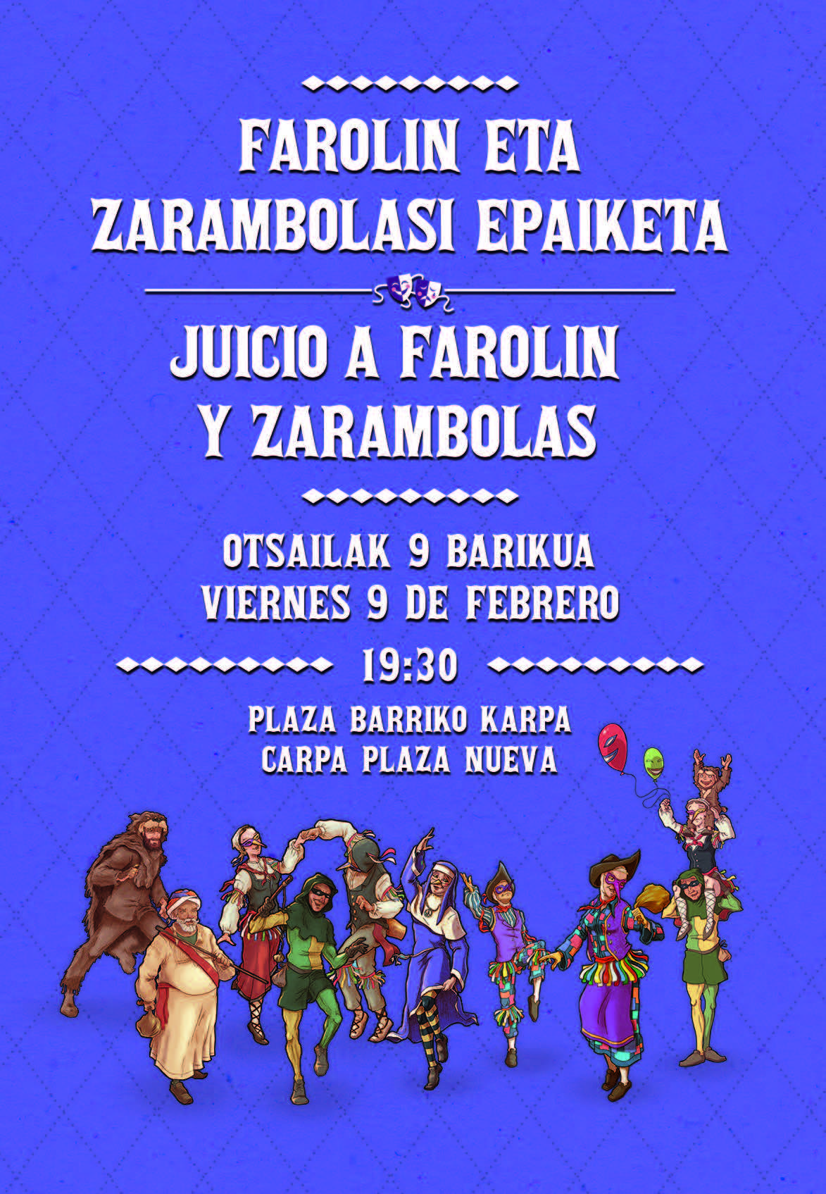 Gure hiribilduan gaiari kutsu txirenea ematea erabaki zen, zintzoaren eta gaiztoaren arteko dikotomia hautsi eta umore ukitua ezarriz, hiritarren izaera arketipikoaren bikoiztasun barregarria agerian uzteko. Gaur egun, Farolin eta Zaranbolasen aurkako herri-auzia haien atxiloketarekin hasten da, udaletxean. Bilboko uriko mazukariek gure protagonistak lagunduko dituzte ziegetara. Behin ziegatan sartuta, Fraisku, Momo, Hartza, Moja, Turko eta Higien kalejira batek bideratuko ditu Plaza Berrira arte, bilbotarron irainak medio, ibilbidean zehar. Berrikuntza legez, aurten, Plaza Barrian zain egongo diren herritarrek zuzenean ikusi ahal izango dute kalejira, bertako pantaila erraldoian.