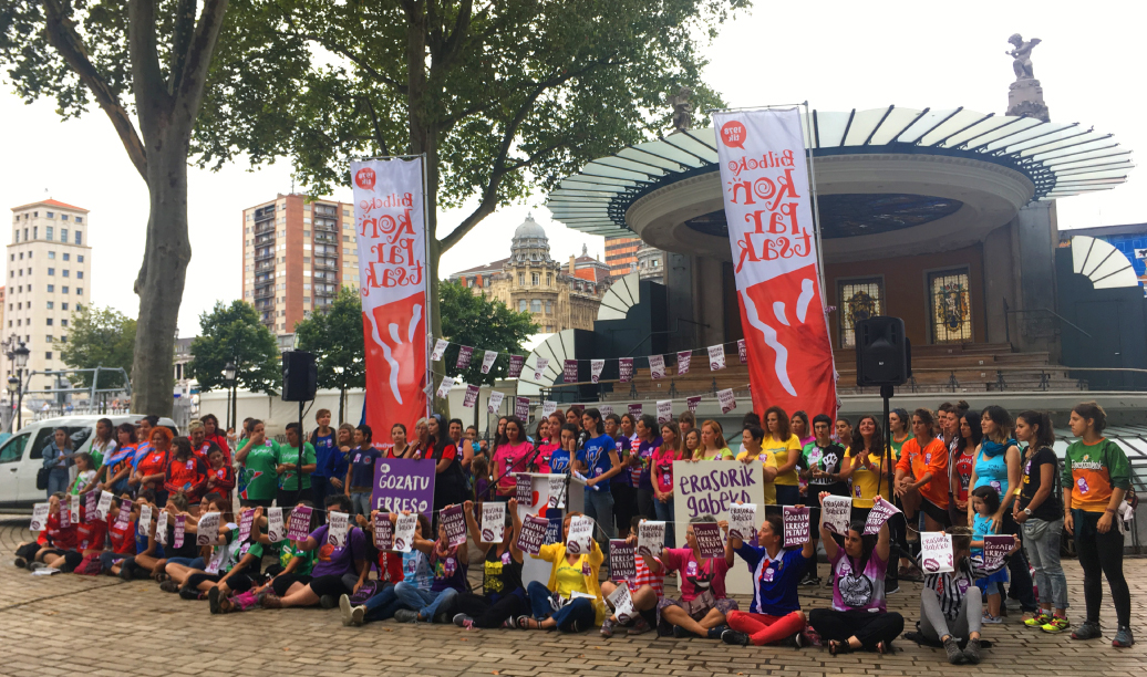 Gaur goizean ehun bat emakumezko konpartsakide elkartu gara Bilboko Areatzan hedabideen aurrean agerraldia egiteko, astebete baino gutxiagoan txosnagunea izango den lekuan bertan. Han argi adierazi dugu erasorik gabeko Aste Nagusia nahi dugula, eta “Nik gozatu, zuk errespetatu, hura zaindu” leloa zeraman afitxa erraldoia erakutsi dugu. Hain zuzen ere, emakumeek askatasun osoz gozatuko ditugulako jaiak, gizonezkoek gure espazioa eta erabakiak errespetatuko dituztelako, eta elkarren zaintzaren kultura gailenduko delako jai-eremuan. Eta lelo horrekin beteko dugu Areatza osoa, ezkiek eutsiko baitituzte banderin moreak, aurten nagusituko den mezua ondo erakusteko.