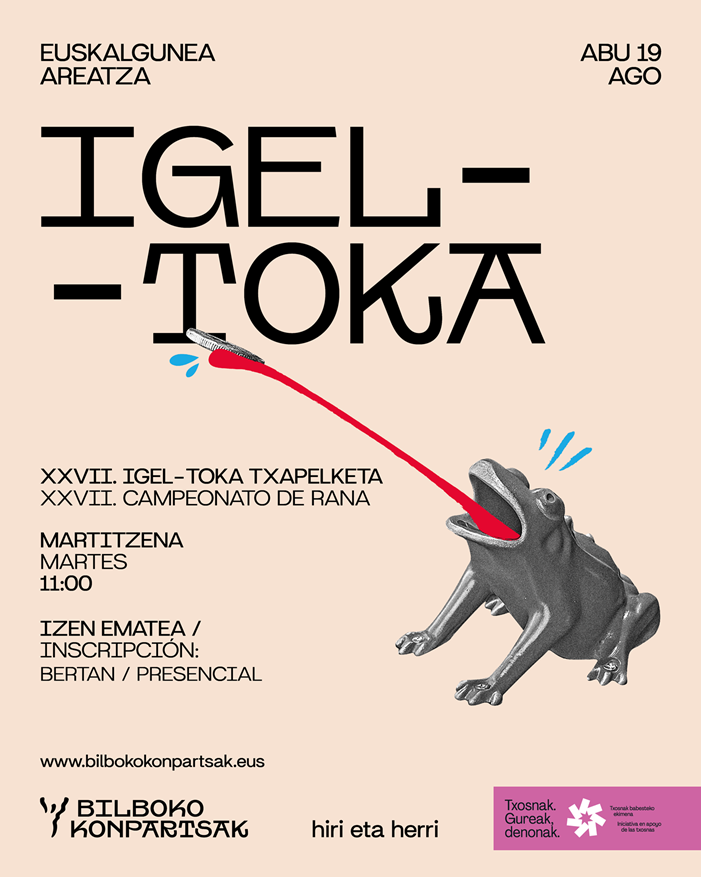 Azalpena: Clásico juego que ha pasado de generación en generación. Para los más jóvenes que no conozcan el funcionamiento, consiste en lanzar unas monedas desde una señalización que se encuentra a 3,5 m de distancia de la ranita e intentar encestarlas por la boca, ¿te parece sencillo? Pues acércate y prueba!!! El que más monedas enceste será el ganador.
