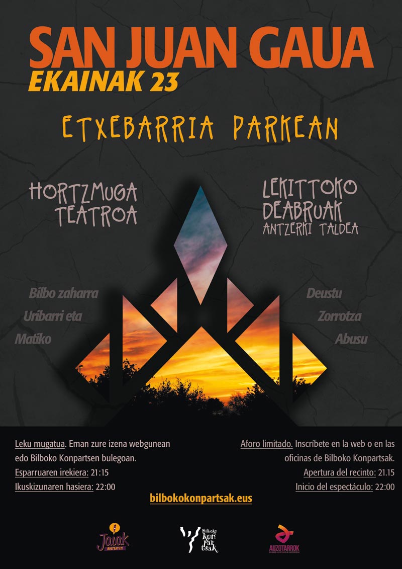Bilboko Konpartsak celebraremos el 23 de junio la noche de San Juan en el parque Etxebarria. A partir de las 22:00. Podremos disfrutar de un teatro musicado de la mano de Hortzmuga Teatroa y Lekeitioko Deabruak. Como el aforo será limitado, quienes quieran acudir deberán inscribirse de antemano mediante este formulario.