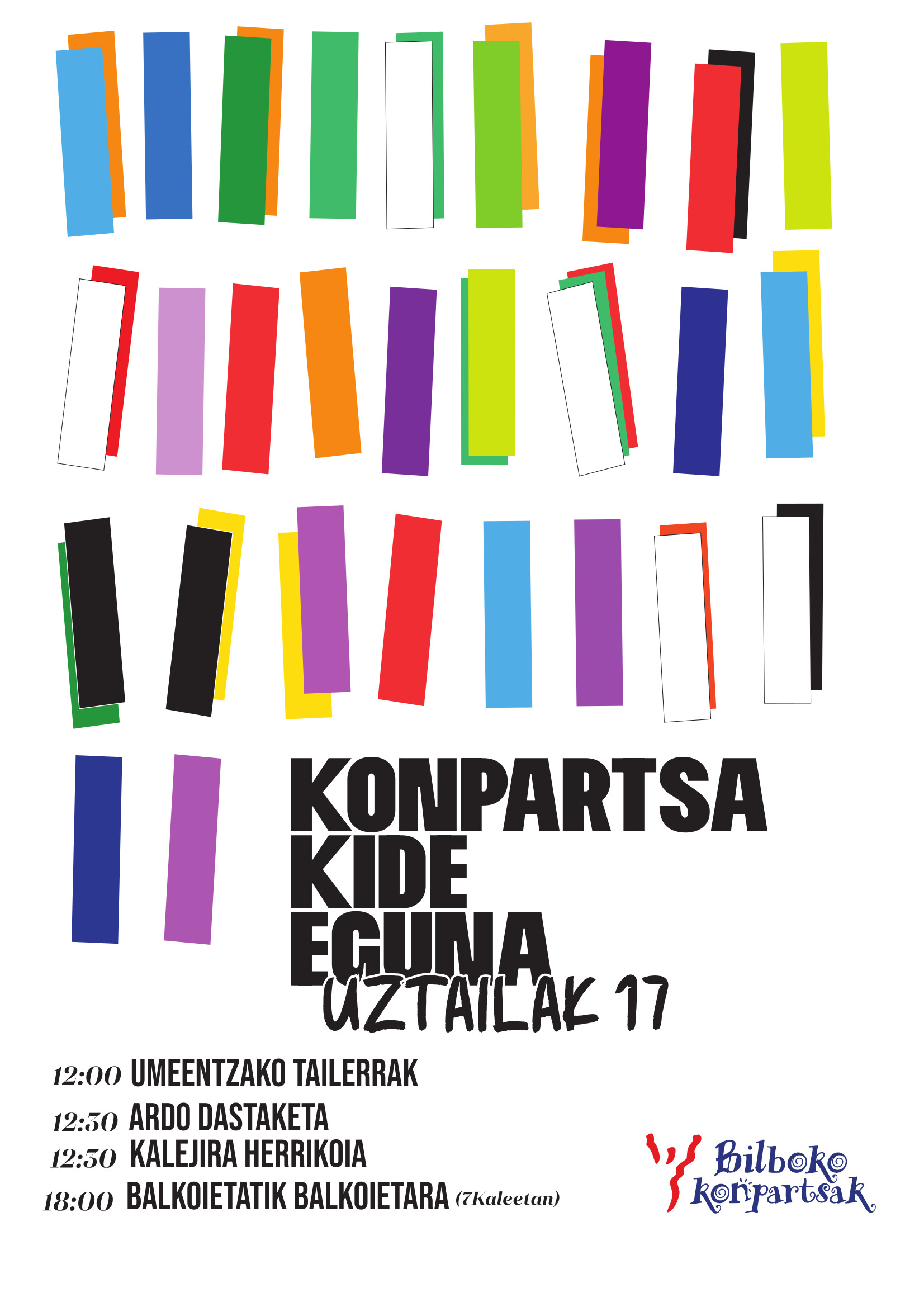 Bilboko Konpartsak ya tenemos preparado el programa del Konpartsakide Eguna que se celebrará pasado mañana en el Arenal bilbaíno. Hemos puesto en el centro «ofrecer ocio y cultura a los bilbaínos y bilbaínas» y hemos facilitado cauces de participación a la ciudadanía. La kalejira popular por la cultura y la vida será el acto central del día, a las 12:30 horas. El programa se completa con talleres infantiles, un curso de cata de vinos, sorteo de verduras de temporada y espectáculos sorpresa.