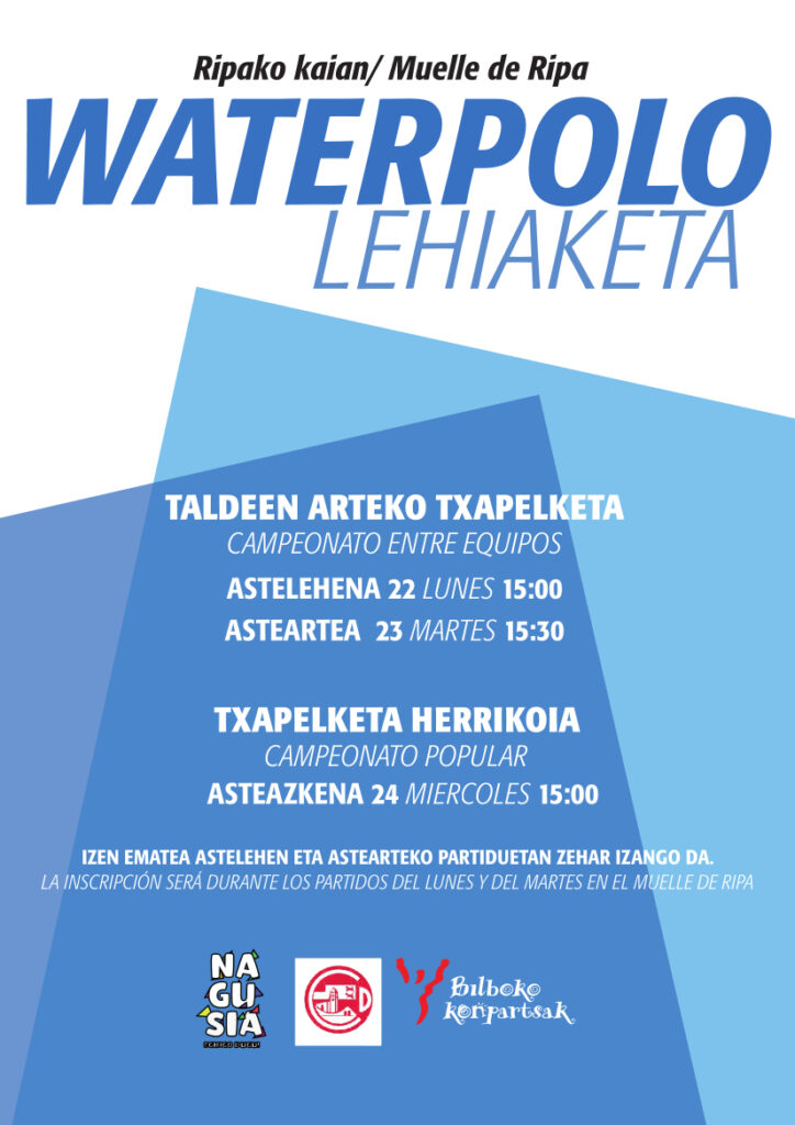 El lunes, martes y miércoles de Aste Nagusia podremos volver a disfrutar viendo y practicando este deporte acuático de la mano de Bilboko Konpartsak, en colaboración con el Club Deportivo Bilbao. El torneo tendrá lugar en el muelle de Ripa, a partir de las 15:00, siendo los días 22 y 23 competición entre grupos y el día 24, campeonato popular. La inscripción podrá hacerse los mismos lunes y martes durante los partidos.