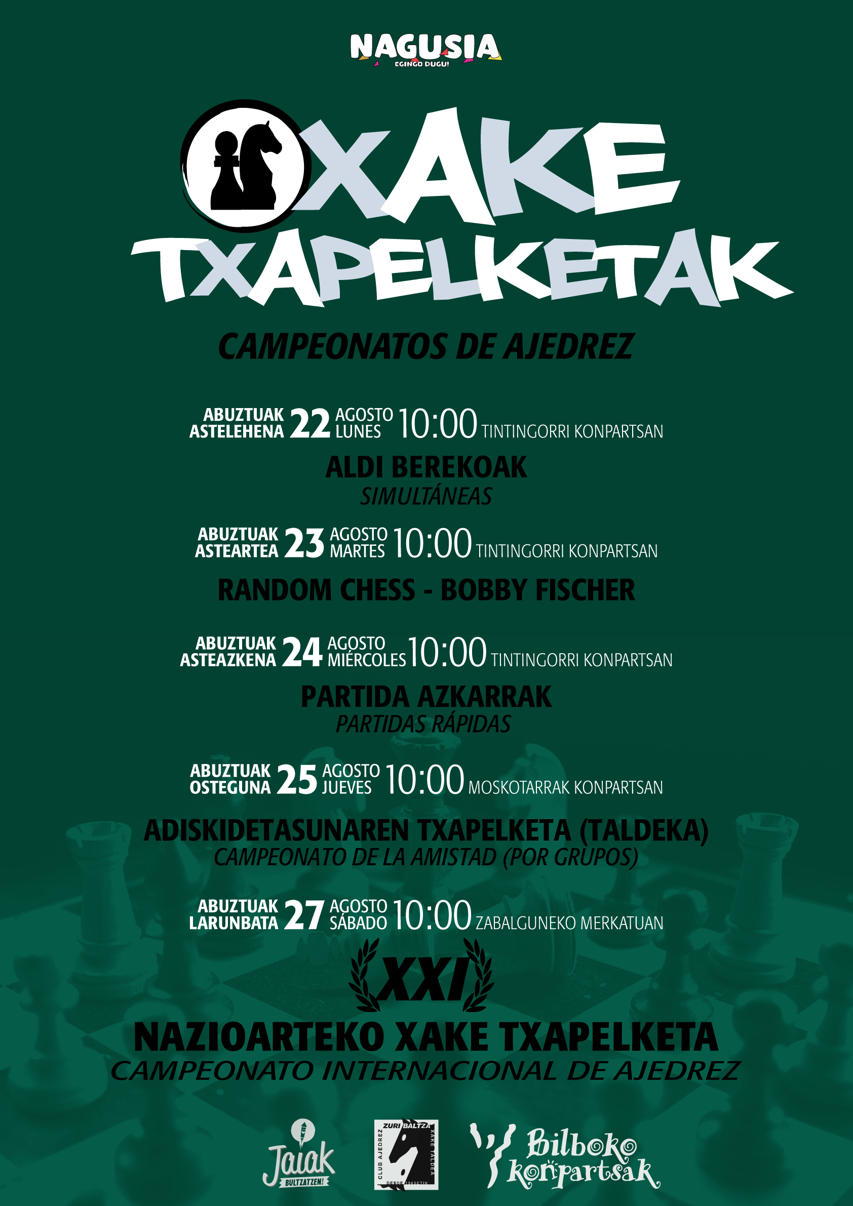 El 23 de agosto en la txosna de la comparsa Tintigorri a las 10:00 horas partidos de random chess-bobby fischer. Inscripción gratuita en la misma txosna.