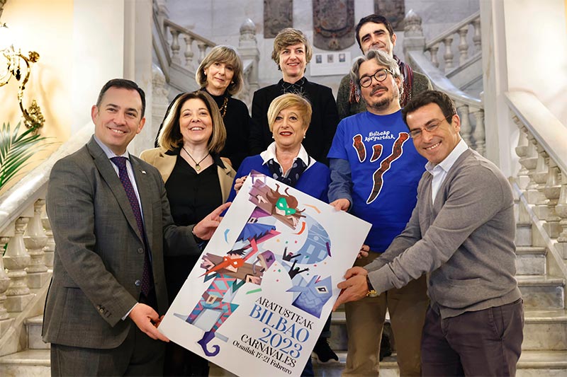 La concejala Itziar Urtasun ha presentado esta mañana el cartel ganador ante la prensa, acompañada por los integrantes del jurado, entre ellos Iñigo Iglesias en representación de Bilboko Konpartsak.