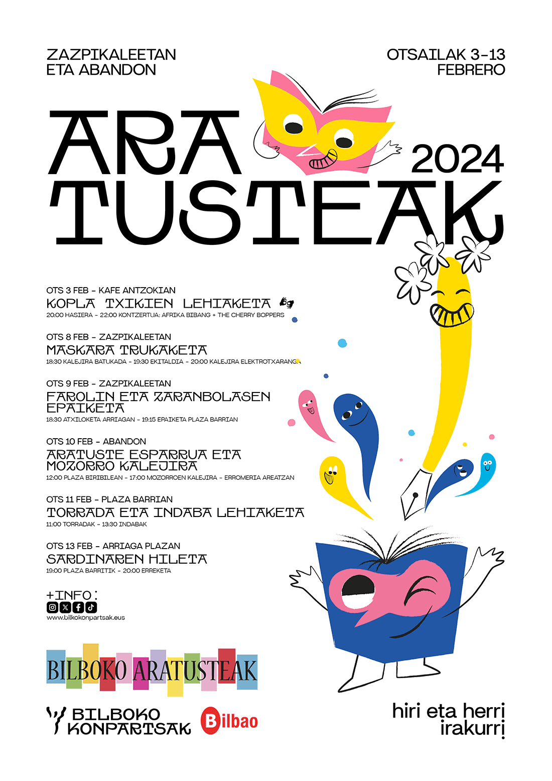 Por último, Idoia Ugalde, en nombre de Bilboko Konpartsak, ha explicado que, además de los 60 años de Harri eta herri de Aresti, este año se celebrarán “más aniversarios que corresponden a los carnavales bilbaínos: 45 años desde que recuperamos los carnavales, 40 años desde que aparecieron los personajes Farolin y Zarambolas, y 25 años desde que se constituyó la Orden Botxera de Farolín y Zarambolas”.