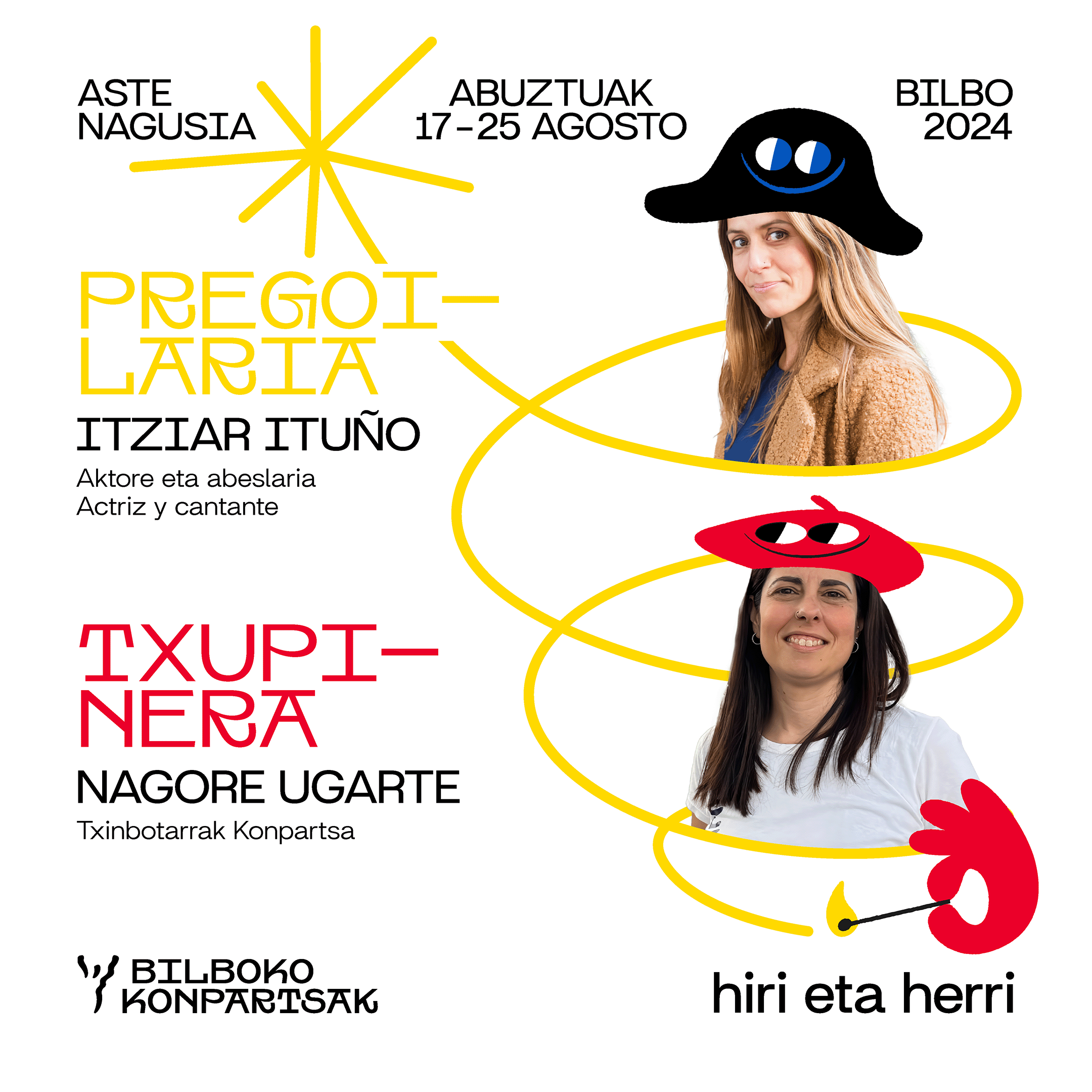 La Comisión Mixta de Fiestas de Bilbao ha anunciado hoy, lunes, quiénes serán la Txupinera y la Pregonera de la Aste Nagusia 2024. Serán, respectivamente, Nagore Ugarte e Itziar Ituño.