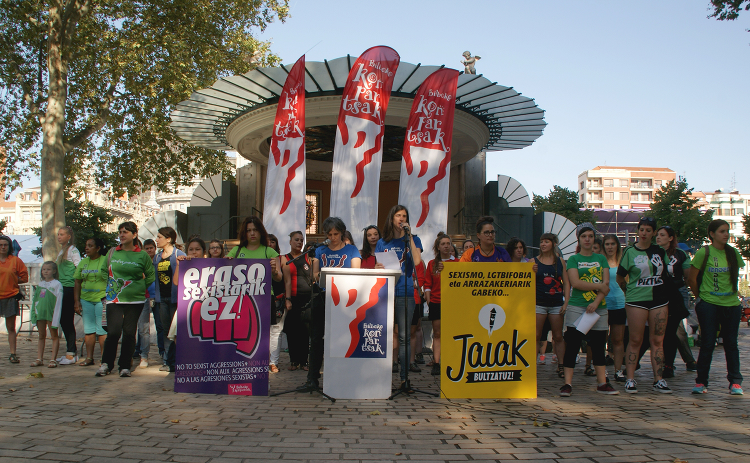 Konpartseras de Bilbao hemos comparecido hoy ante los medios de comunicación para pedir un cambio de actitud y que se rompa con el guión establecido para erradicar la lacra de las agresiones. Hemos destacado el papel determinante que cada persona tiene, y que se deben señalar las actitudes y comportamientos que no promueven un giro radical hacia una Aste Nagusia parekide, en igualdad y feminista. Hemos pedido que se responda ante cualquier manifestación de machismo y de agresión sexista, sea del tipo que sea, provenga de un desconocido o de los propios amigos. También que el rechazo a los agresores sea contundente y multitudinario. Y, en caso de activarse el Protocolo debido a una agresión, hemos instado a la ciudadanía a estar atenta a los pasos que se vayan a dar y a sumarse a las movilizaciones.