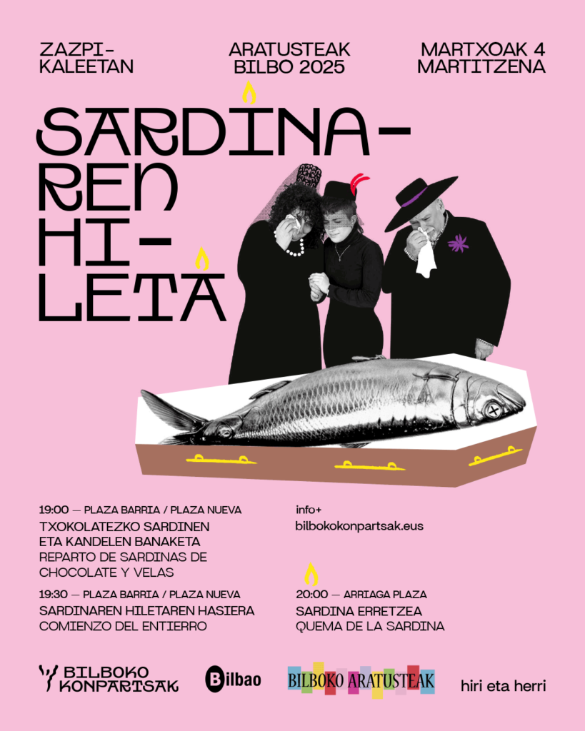 Se realiza un velatorio de la sardina en la Plaza Nueva y luego se lleva en cortejo fúnebre por el Casco Viejo hasta el Arriaga, donde se quema.