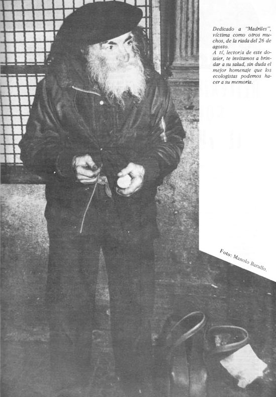 Bilbotarrek bihotz handiak dituzte eta elkartasuna zer den ondo dakite, horregatik kartoiak biltzeko erabiltzen zuen gurditxoa lapurtu ziotenean, Zazpi Kaleetako langile guztiek dirua bildu zuten berri bat erosteko. Madriles-i ez zitzaion inoiz ere falta izan Barrenkaleko taberna batean kafe bat edota txikitoren bat hartzeko txoko bero bat, eta neumonia saiesteko, tabernariek haien tabernetan lo egiten uzten zioten gaurik euritsuenetan. 1983Ko abuztuaren 26ko gau hartan zerua hiriaren gainera isuri zen. Itsasadarrak ezin izan zion gehiago eutsi eta gainezka egin zuen, festak, alaitasuna eta bidean topatzen zuen guztia suntsituz. Uda euritsu hartako gauero bezala, Madrilesek Barrenkaleko taberna batean egiten zuen lo, eta han irentsi zuen lupetzak. Horren ostean Bilbo ez zen sekula lehengora itzuli. Madriles ez zuten uholdeek hil, Madriles etxegabea izateak eta etxebizitzaren beharraz aberasten direnen askonahiak hil zuen. Gaur, atzo bezala, Bilbo hiri borrokalari eta solidarioa dugu. Ongietorriak dira gure hirian beste Madriles asko. Berdin dio milaka kilometrotara jaio bazara, berdin dio nondik zatozen: ez ahaztu inoiz ere bilbotarrok gura dugun tokian jaiotzen garela!