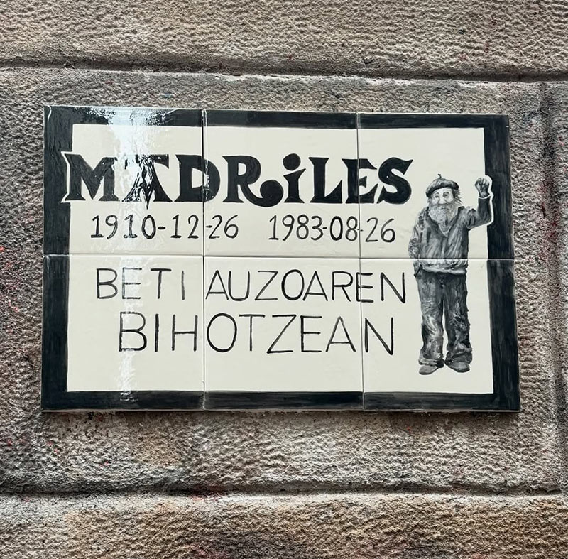 Bere oroitzapena bizirik mantentzeko eta bere izaera askea, menderaezina eta kaskagogorra omentzeko, Bilboko Konpartsek buruhandi bat sortu zuten bere omenez, baita mosaiko eder hau ere, eta modu honetan, Madriles betirako bizi izango da Bilboko alde zaharraren bihotzean.